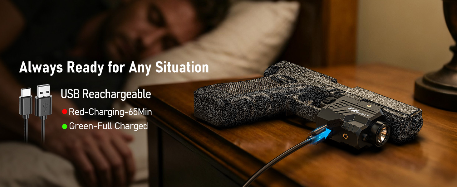 • USB Rechargeable: EZshoot Picatinny flashlight laser combo features the built-in USB charging port that allows for recharging without removing from the pistol, ensuring it is always ready for any situation. The gun flashlight running time is 60 minutes for flashlight and 12 hours for laser only.