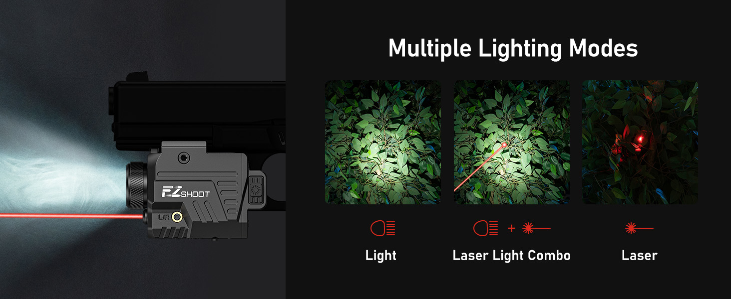 • Multiple Lighting Modes: The compact pistol light has different lighting modes: LED white light (constant and strobe), laser only and laser light combo, which can meet target acquisition or other requirements.