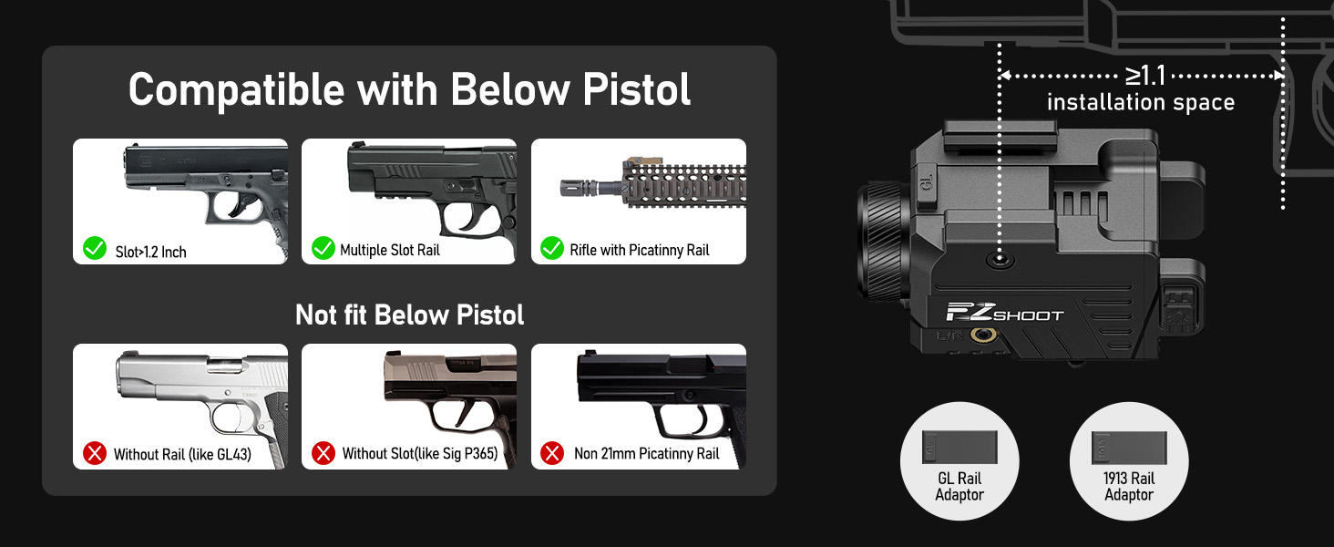• Universal Compatibility: The handgun lights includes both GL and 1913 Picatinny slide rail adaptors, making gun lights for pistols compatible with Glock-style rails and standard Picatinny rails. Note:not compatible with device lack of rail and slot.