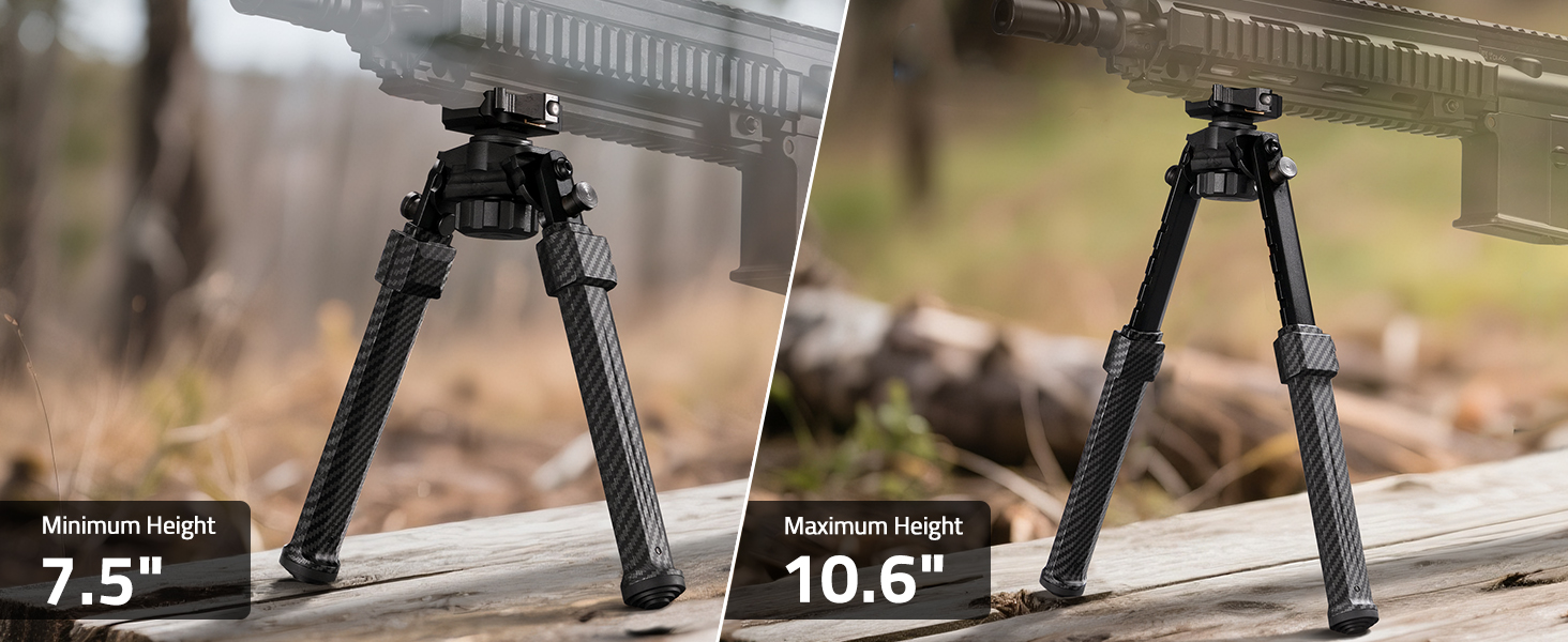 • 【Adjustable Height】The bipod leg height can be adjusted by pressing the leg release button. The adjustable range is 7.5-10.6 inches. The appropriate height can be adjusted according to shooting require.